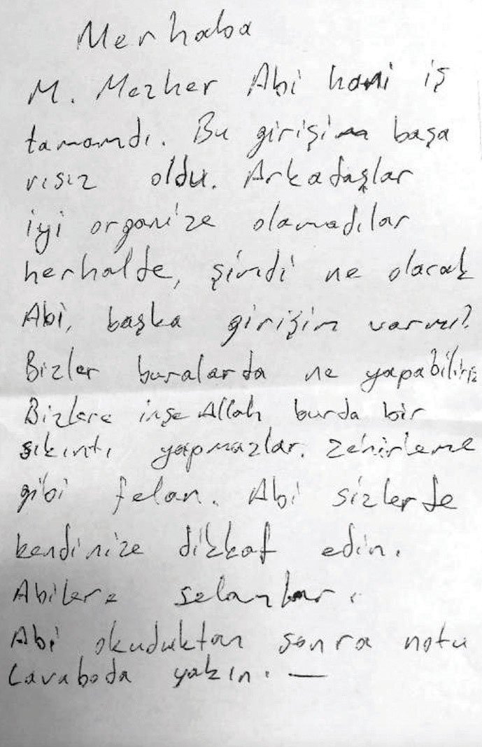FETÖ'nün okullarının ve dershanelerinin Türkiye sorumlusu olduğu ileri sürülen, Gülen'in yeğeni Mehmet Mezher Gülen'e gönderilen bir not aslında bu darbenin FETÖ tarafından gerçekleştirildiğini ispat eden delillerden sadece bir tanesi. İzmir'in Kırklar ilçesinde bulunan 2 Nolu F Tipi Yüksek Güvenlikli Kapalı Ceza İnfaz Kurumu'nun havalandırma alanlarında 21 Temmuz günü infaz koruma memurları tarafından bulunan ve cezaevi yönetimince İzmir Cumhuriyet Başsavcılığı'na gönderilen notta, FETÖ mensuplarının girişilen darbe girişiminin başarısız olduğundan ötürü yaşadıkları hayal kırıklığına şahit oluyoruz.