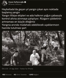 Ülkemizde yaz aylarında küresel iklim değişimi ve terör bağlantılı odaklar eli ile birçok yangın aynı anda gerçekleşti. Topyekûn bir mücadeleyle yangınlar ile uğraşırken bir yandan da yalanlar ile uğraşmak zorunda kaldık. Canan Kaftancıoğlu tarafından Heybeliada'da yangın çıktığı ve hiçbir uçakla müdahale edilmediği algısı oluşturuldu. Ancak Orman Genel Müdürlüğü tarafından yaşanan gelişmeler ve yangın söndürmede kullanılan araçlar hakkında bilgi gecikmedi. 1 uçak, 3 helikopter ve 5 arozöz ile yangına müdahale edilmesine rağmen Kaftancıoğlu'nun yalanı öne çıkarılmaya devam etti.