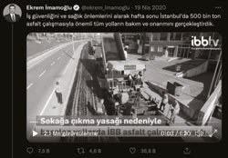 CHP'li İstanbul Büyükşehir Belediye Başkanı Ekrem İmamoğlu, pandemi sebebiyle evde kaldığımız günlerde imkânsız bir gerçek dışı iddiada bulundu. Kimsenin dışarı çıkmadığı bir gün, göz boyamanın mümkün olacağını düşünmüş olacak ki gururla sosyal medya üzerinden "Hafta sonu İstanbul'da 500 bin ton asfalt çalışmasıyla önemli tüm yolların bakım ve onarımını gerçekleştirdik" iddiasında bulundu. Esenler Belediye Başkanı Tevfik Göksu, "Yalan Rüzgârı devam ediyor, İBB'nin 1 yıllık asfaltı ortalama 2,5milyon/Ton İBB Başkanı '2 günde 500 bin ton' yani 1 yıllık asfaltın 1/5'ini attığını söylüyor. En iyi günde bile 25 bin/ton asfalt atılırken, daha hastane yolunu yapmayan İBB Başkanı yalan rüzgârına devam ediyor" açıklamasında bulundu. Başkan Göksu, ayrıca İBB'nin geçmiş yıllardaki asfalt çalışma faaliyet raporunu da paylaştı.